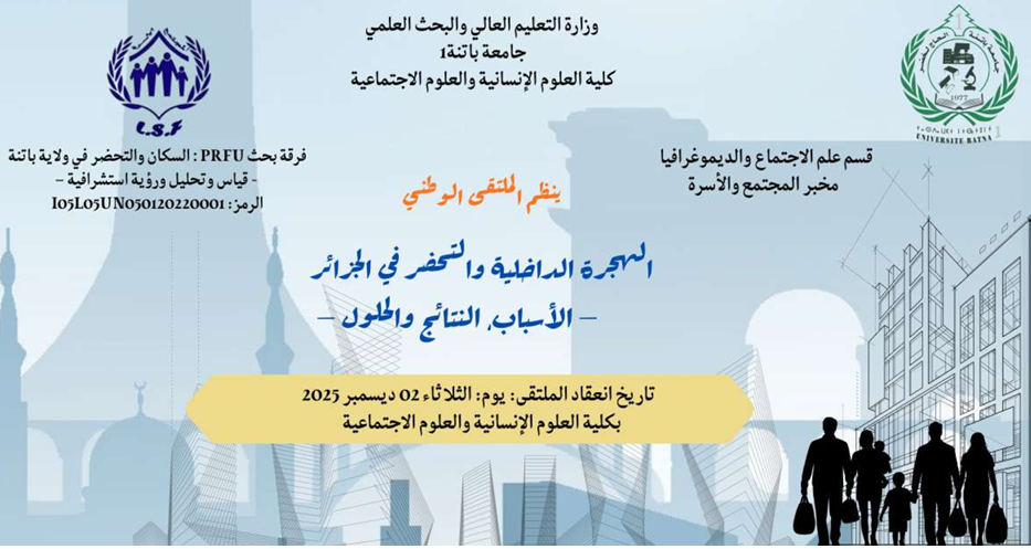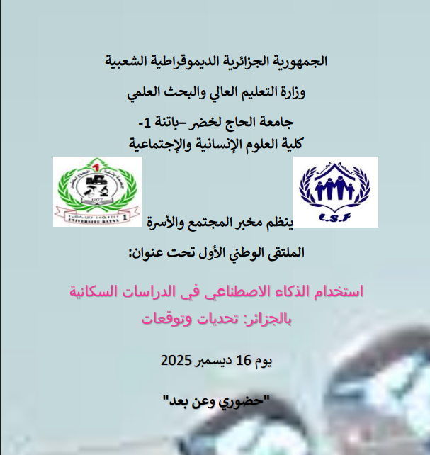 فكر وإبداع ورقي كلية العلوم الإنسانية والاجتماعية المستجدات جديد برنامج الملتقى الوطني حول: الدور التاريخي لمفجري الثورة التحريرية… جديد ملتقى وطني حول: الهجرة الداخلية والتحضر في الجزائر-الأسباب والنتائج والحلول- جديد ملتقى وطني حول: استخدام الذكاء الاصطناعي في الدراسات السكانية بالجزائر: تحديات وتوقعات جديد ملتقى وطني حول: كبار السن والحماية الاجتماعية في الجزائر:واقع متحول وآفاق واعدة جديد ملتقى دولي حول: تقييم التجربة الجزائرية في مجال مواجهة سلوك التطرف (يومي 10-11 ديسمبر 2025) … جديد جديد مناقشات الدكتوراه 2025 1 2 فضاء الطالب فضاء الأستاذ الفضاء الرقمي الدراسات العليا أقسام الكلية قسم علم النفس وعلوم التربية والأرطفونيا قسم علم الاجتماع والديموغرافيا قسم التاريخ وعلم الآثار قسم علوم الإعلام والاتصال وعلم المكتبات قسم التعليم المشترك في العلوم الإنسانية والاجتماعية قسم الفلسفة بيداغوجيا برامج الدراسة قوائم الطلبة برامج الامتحانات البحث العلمي مخابر البحث العلمي الانتاج العلمي للأستاذ مشاريع البحث PRFU