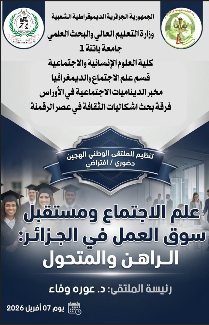 كلية العلوم الإنسانية والاجتماعية بالتنسيق مع مخبر الديناميات الاجتماعية في الأوراس ينظمان ملتقا وطنيا بعنوان: